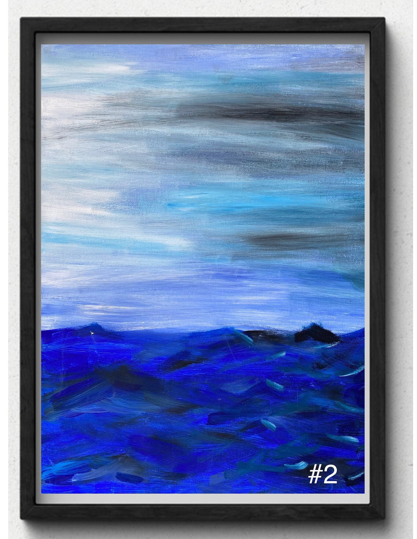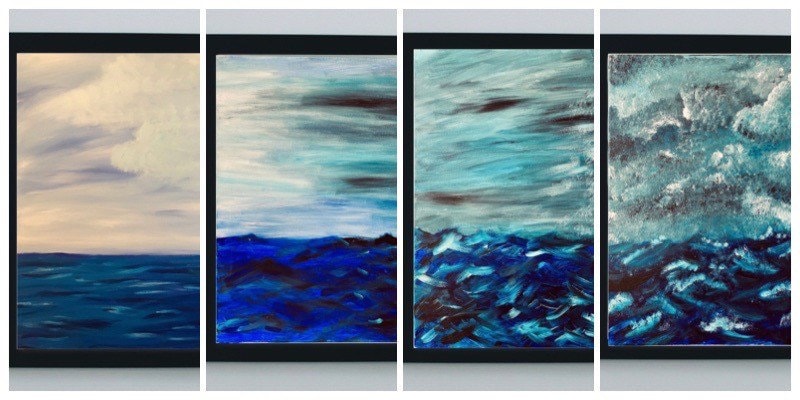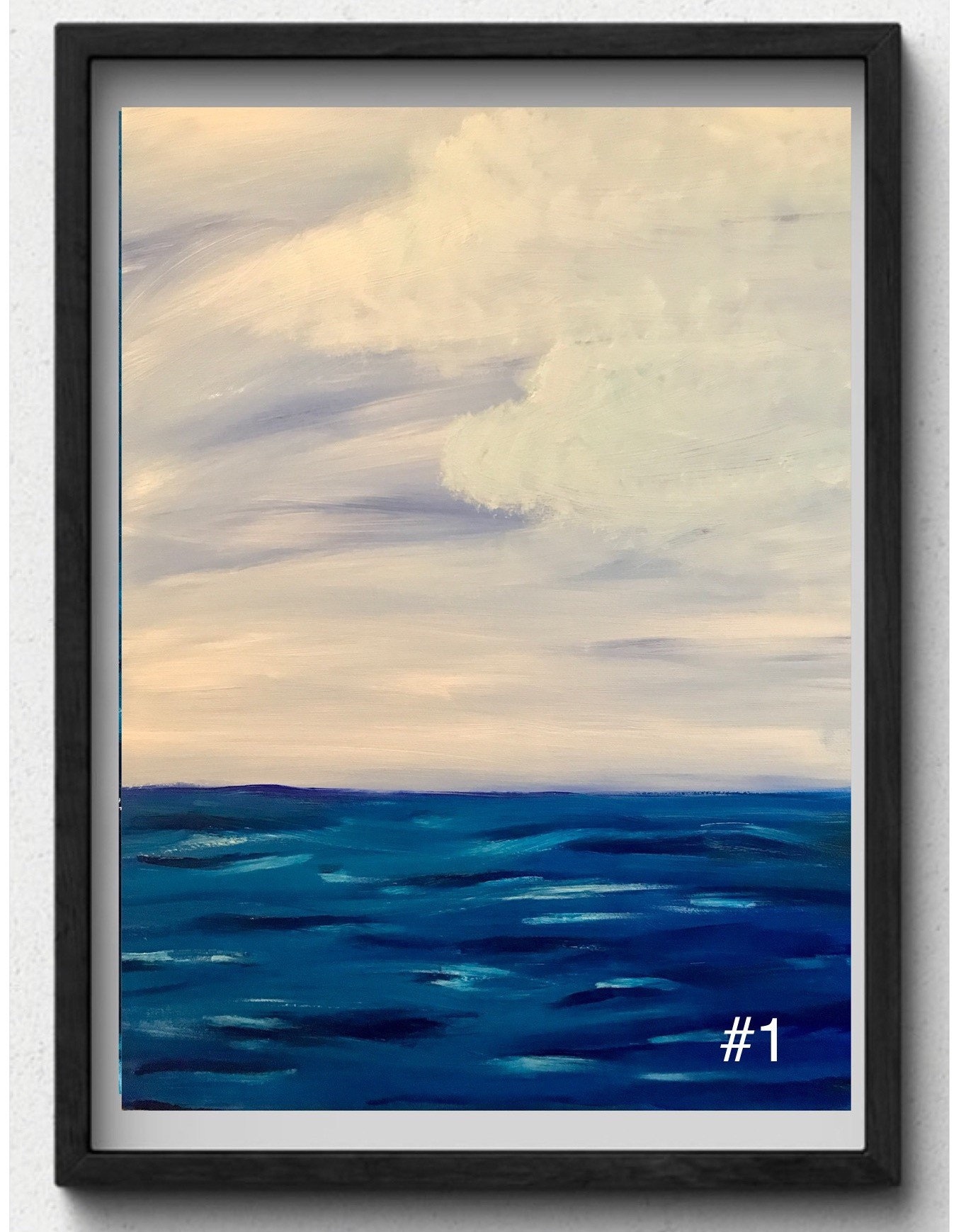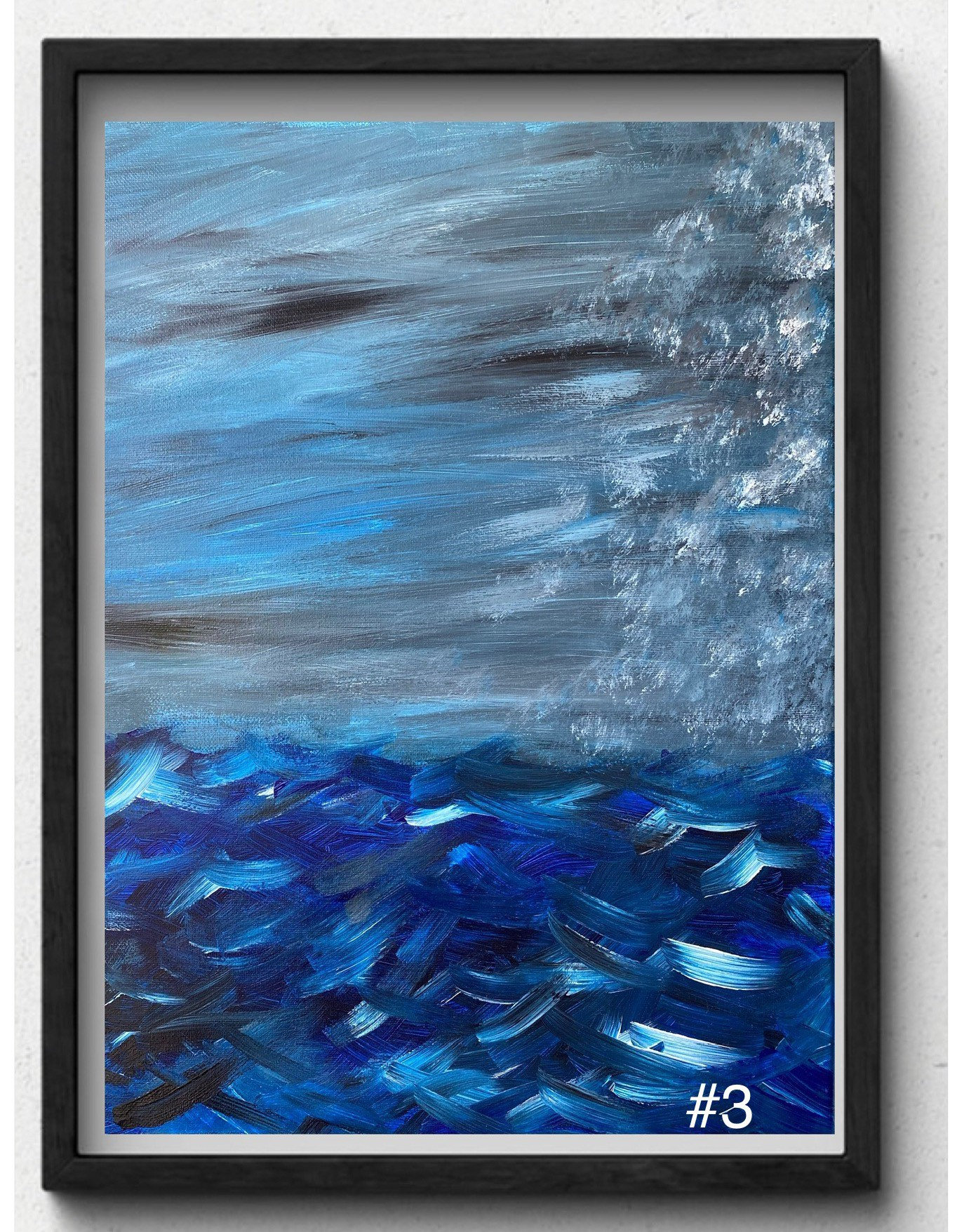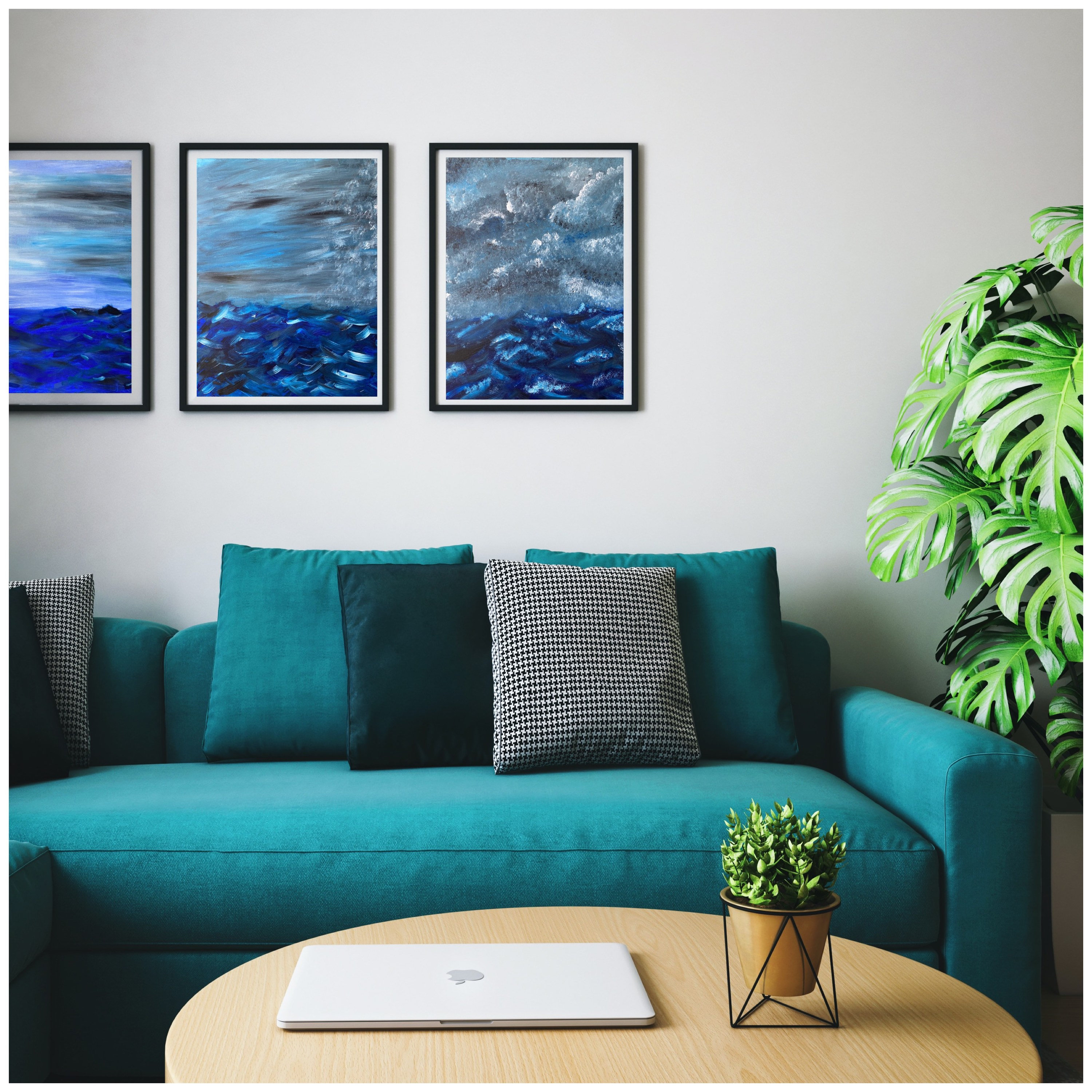This print depicts the emotion of the ocean waters as the weather changes with each scene. The clouds change temperature and texture as the ocean water changes colors. Starting with a serene and calm day, blue skies and still waters the scene quickly transitions to hurricane force winds and rolling waves at sea. This piece of art will make a beautiful addition to any home or office and is the perfect gift for a loved one. Series art can be purchased as a set or as individual pieces, allowing the selector to "mix and match" based on the size of the room and personal preference.