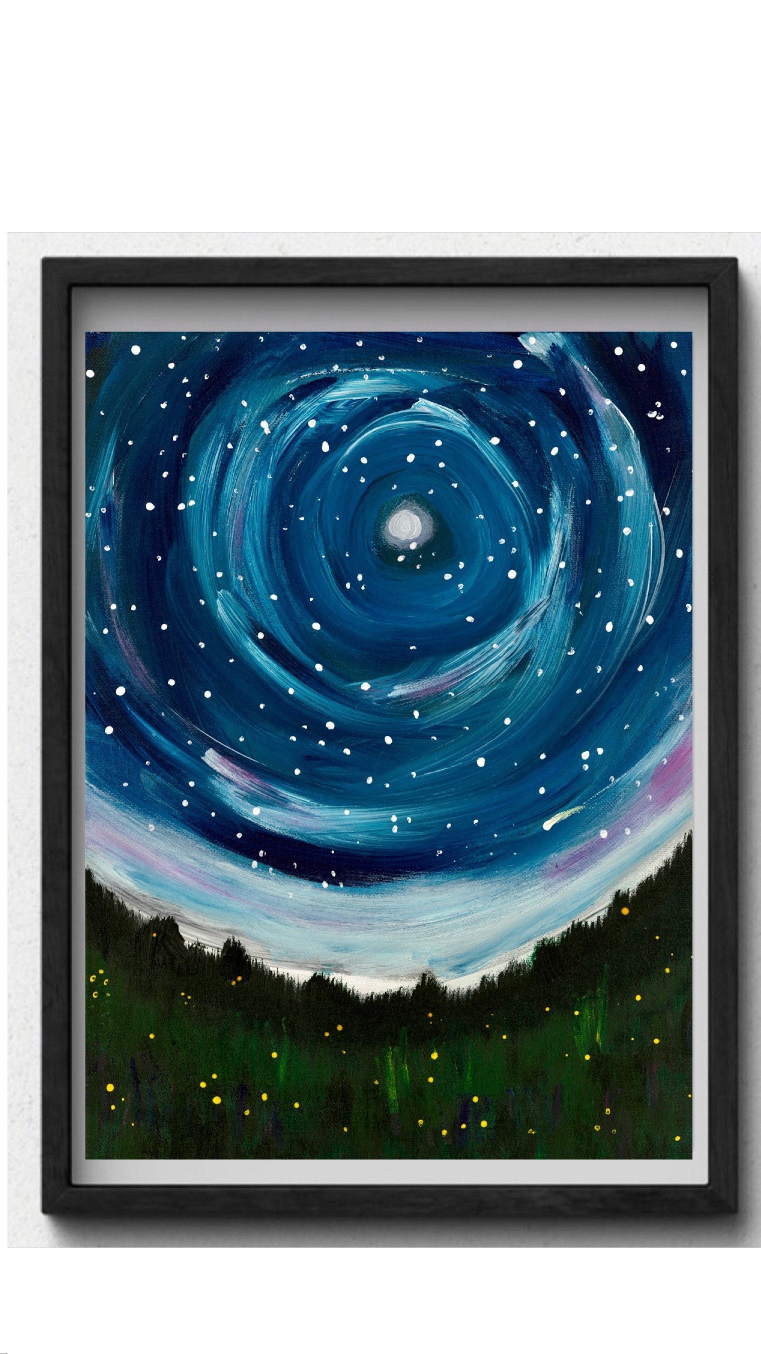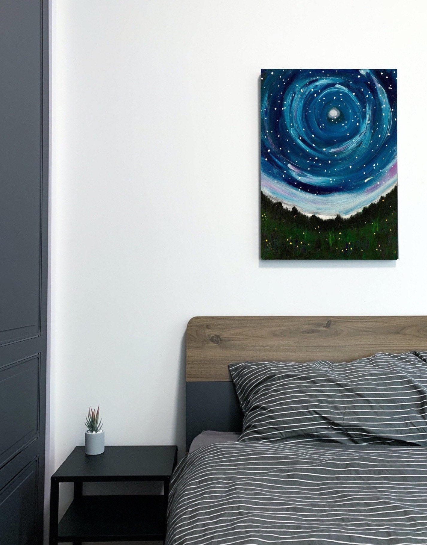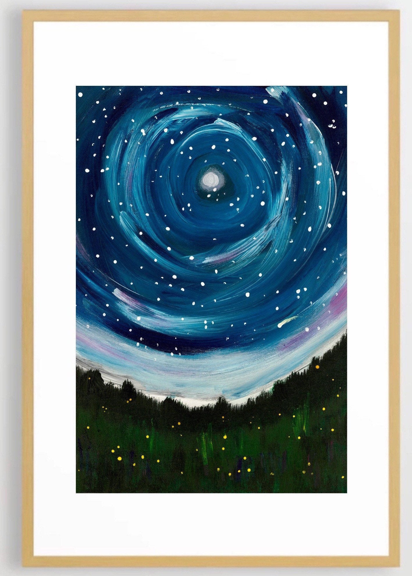 Add a touch of magic to any room with our most popular piece, the acrylic painting “Hope”. Love is in the air on a starry night sky in this art print. Shooting stars and comets swirl through the snow filled night sky with different hues of whites, blues, and purples.
